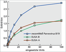 Signalstärke des recomWell Parvovirus B19 im Vergleich zu zwei weiteren, kommerziell erhältlichen ELISAs. Als Probe wurde eine Verdünnungsreihe des Parvovirus B19 WHO-Standards eingesetzt.