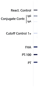 After screening by ELISA the recomLine Bordetella pertussis IgG, IgA can be used for clarification of borderline and positive ELISA-results and for the determination of the actual immune status.