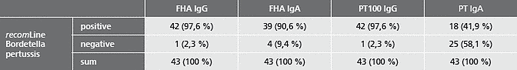 Bordetella pertussis is the main agent of the „whooping cough“, a disease often lasting for weeks til months. The passive immunoprotection transferred from mother to fetus is usually incomplete or inexistent. Therefore especially infants are imperiled by apnea (stop breathing) which can lead to death. Mild courses can be caused by related agents i.e. B. parapertussis. Several vaccinations are recommended especially for infants to provide at least some immunoprotection.Besides the clinical diagnostics (long persisting cough with staccato cough attacks) the serological diagnostics is applied to determine the status of immunity (possibly after vaccination) and an acute infection. The new antigen PT-100 is used to standardize the recomLine Bordetella pertussis according to the WHO-standard and the guidelines of the German Robert-Koch-Institute. PT-100 detects an antibody titer >= 100 WHO units. A reactive PT-100 band corresponds with high probability to an acute infection when clinical symptoms appear (considering the vaccination managment).