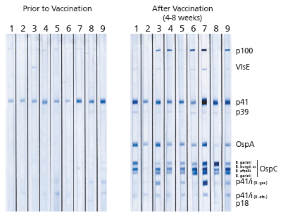 Prior to the vaccination all dogs showed the generation of antibodies against p41 in recomBlot Borrelia canis IgG. In addition, weak band intensities below the cutoff were visible for p41i in the sera 5, 8 and 9, for p100 in the sera 1, 4, 5 and 7, and for VlsE in serum 3. After the second vaccination the dogs develop anti-Borrelia IgG-antibodies against all antigens on the blot strip in different intensities and patterns. Eight out of nine dogs showed an intensive OspA band after the second vaccination on recomBlot Borrelia canis IgG test strips (OspA is an important target for neutralising antibodies. Borrelia burgdorferi is already neutralized in the bowels of the tick through the host antibodies in the blood which was absorbed).