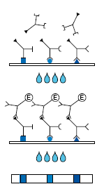 5 - 10 minutes after addition of the coloring solution, insoluble colored bands develop at the sites on the test strips occupied by antibodies.