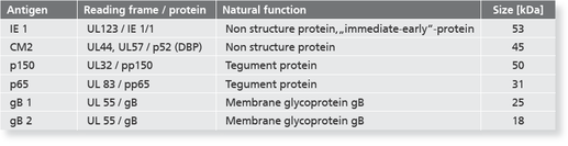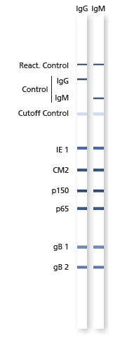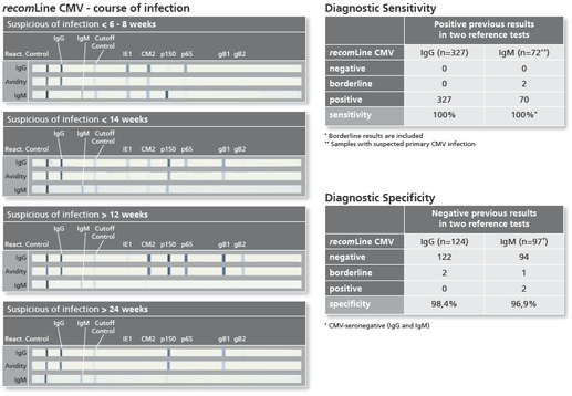 The recomLine CMV is a line immunoassay using all diagnostic relevant CMV antigens in a recombinant format optimized to highest performance in sensitivity and specificity at the same time. Purpose of the assay is the confirmation of positive and unclear screening results (confirmatory assay). Especially the low predictive value of positive IgM results due to persistent or recurrent infections has to be clarified. The test system either is able to determine IgG and IgM antibodies and the avidity of IgG antibodies. Using phase-specific antigens and separate avidity antigens (patented method from MIKROGEN on line immunoassays) the test system can detect CMV specific antibodies in all phases of the infection. Despite viral load the recomLine CMV can be used in pregnancy diagnostic or pre-surgical diagnostic of transplant settings to precisely state if the patient can be judged acute infected or shows typical antigen patterns of a long past infection. While supporting a clear answer to the question what impact the detected CMV antibodies for this particular patient have, this assay can help to optimize therapy, improve disease burden and give patient and doctor relief on reduced acuteness.