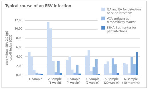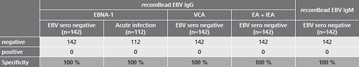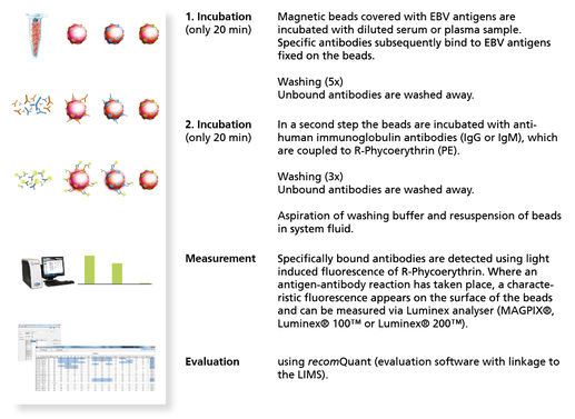 - safe detection of acute EBV infections already in the early phase due to the optimized antigen combination in the recomBead EBV IgG 2.0 and recomBead EBV IgM 2.0 test Systems