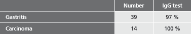 An infection with Helicobacter pylori induces a specific immune response. As a rule, antibodies of the classes IgG and IgA can be detected. Only small amounts of IgM antibodies are identified. Indeed, there is a decrease in the antibody concentration after successful eradication through combined antibiotic therapy.