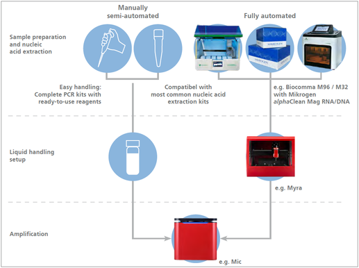 MIKROGEN alphaClean Mag RNA/DNA kits are magnetic particle-based extraction systems for isolating nucleic acids from a range of sample materials. Processing on our Biocomma M32 or M96 extraction systems guarantees you fast, easy and automated extraction and provides optimal eluates for use with MIKROGEN ampliCube real-time PCR testing. Alternatively, you can also use a system based on spin column technology, our alphaClean Pure RNA/DNA kit, for manual processing.