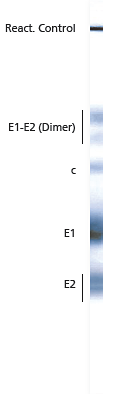 The recomBlot Rubella IgG uses Rubella virus lysate produced in Vero cells. All Rubella specific antigens which are important for a accurate serological determination are presented by electrophoretic separation and subsequent transfer to a nitrocellulose membrane (Western Blotting). IgG conformation antibodies against the Rubella antigen E2 appear three month after vaccination or infection at the earliest. An infection within the last three month can be serologically ruled out if the E2 band is detectable.