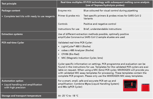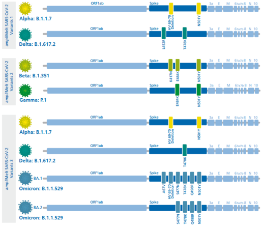Reagent sets for the detection and differentiation of the SARS-CoV-2 Variants of Concern Alpha, Beta, Gamma, Delta and Omicron by real-time multiplex RT-PCR with subsequent melting curve analysis.