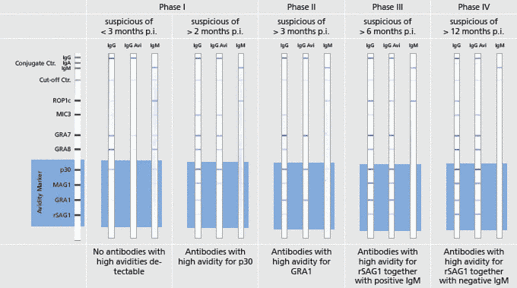 The recomLine Toxoplasma is worldwide the only test system which meets the requirements for the special diagnosis of toxoplasmosis especially for pregnancy. The optimized combination of using recombinant antigens for IgG and IgM and also 4 different phase specific avidity antigens is unique on the market for the determination of the status of a Toxoplasma infection.
