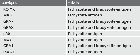 Strip-Immunoassay with antigens produced by recombinant techniques for the detection of IgG, IgM and IgA antibodies against Toxoplasma gondii