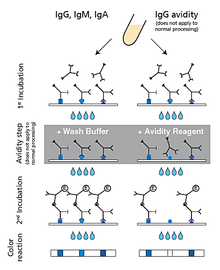 Wash buffer is added to one strip and the dissolved avidity reagent is added to the other strip, followed by a 3 minute incubation. Low avidity antibodies will be “washed off” by the avidity reagent.