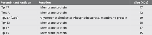 - Use of pathogen specific Treponema antigens Tp 47, Tp17 and Tp 15 as well as TmpA