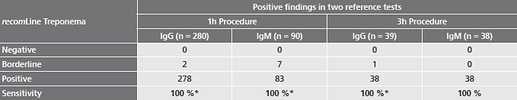 The serologic diagnosis of syphilis intends the use of a sensitive antibody screening assay (TPHA/TPPA, ELISA) in the first step. In the case of equivocal or positive results in the screening test a confirmation assay is performed in the second step to assure the specificity (FTA-ABS, immunoblot). Here the immunoblot plays a very important role, as only with this technique the determination of antibody production against essential Treponema pallidum antigens is possible. At the same time the detection of different antibody classes is possible. With the use of recombinant antigens the recomLine Treponema IgG, IgM meets all these requirements perfectly.