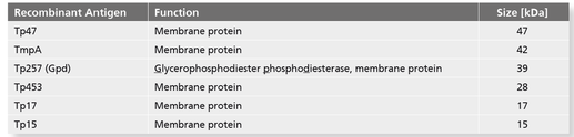 - Use of the highly specific Treponema antigens Tp47, Tp17, Tp15 and TmpA as well as Tp257 (Gdp)