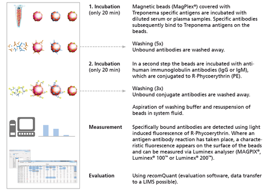 The recomBead Treponema for the detection of IgG or IgM antibodies against Treponema pallidum is based on recombinant antigens and can serve as a confirmation assay for Treponema infections just like the immunoblot.