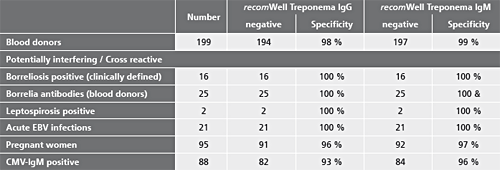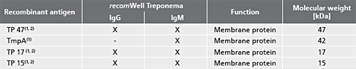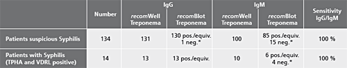 The serodiagnosis of syphilis is performed in steps. As a rule, the T. pallidum hemagglutination assay (TPHA) is used as an antibody screening test. As modern screening test system, the recomWell Treponema IgG, IgM is an excellent alternative. The main advantages of the recomWell Treponema tests are the possibility to distinguish between IgG and IgM antibodies and the capacity to process large numbers of samples accompanied by an automated readout. In addition, by the use of purified, recombinant antigens, the recomWell Treponema tests offer a reproducible higher specificity with maximum sensitivity.