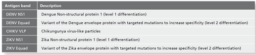 - New antigens: Higher sensitivity by using CHIKV VLP, DENV and ZIKV Equad proteins, as well as improved flavivirus differentiation