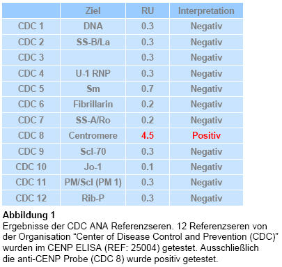 Die systemische Sklerose (SSc) ist durch Autoantikörper gegen intrazelluläre Zielstrukturen wie Scl-70 (Topoisomerase I; Topo I), Fibrillarin, das human Exososom (PM/Scl complex) und die Zentromer Proteine (CENP) charakterisiert. Anti-Zentromer Antikörper treten in 20-50% der Patienten mit SSc auf, abhängig vom Detektionssystem und von der Patientengruppe. Ferner findet man diese Antikörper auch bei Patienten mit systemischem Lupus Erythematosus (SLE) und rheumatoider Arthritis (RA), jedoch mit geringerer Frequenz. Einige Studien haben gezeigt, dass anti-CENP-B Antikörper häufig bei Patienten mit dem CREST Syndrom (calcinosis, Raynaud phenomenon, esophageal dysmotility, sclerodactyly, and telangiectasia) auftreten. Ferner deuten anti-CENP Antikörper auf eine gute Prognose für den Krankheitsverlauf hin.