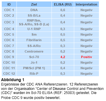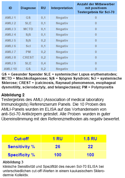 Ein charakteristisches Merkmal von systemischen Autoimmunerkrankungen sind zirkulierende Autoantikörper gerichtet gegen intrazelluläre Strukturen insbesondere gegen Antigene aus dem Zellkern. Antikörper gegen Scl-70/Topoisomerase 1 (topo-1) gelten als spezifischer Marker für die Diagnose von systemischer Sklerose (SSc), auch als Sklerodermie bekannt. Anti-Scl-70 Antikörper werden mit hoher Prävalenz von bis zu 70% bei Patienten mit SSc und dif-fusen Hautmanifestationen gefunden und sind mit schweren Verlaufsformen der Erkrankung assoziiert. Die Korrelation zwischen anti-Scl70 ELISA Titern und der Krankheitsaktivität und dem Schweregrad der Erkrankung wird diskutiert und muss in weiterführenden Untersuchungen abschließend bewertet werden.