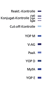 Streifen-Immunoassay mit rekombinant produzierten Antigenen zum Nachweis von IgG-, IgM- oder IgA-Antikörpern gegen Y. enterocolitica und Y. pseudotuberculosis. Durch den Nachweis speziesspezifischer IgG-Antikörper ist eine Differenzierung zwischen Y. enterocolitica und Y. pseudotuberculosis möglich.