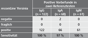 Für die recomLine Yersinia Tests werden die an der Zelloberfläche lokalisierten plasmidkodierten Virulenzproteine (Yersinia Outer Proteine) und Adhesine zur serologischen Speziesdifferenzierung zwischen Y. enterocolitica und Y. pseudotuberculosis rekombinant hergestellt. Diese Proteine werden nur von humanpathogenen Yersinia Stämmen exprimiert. Die recomLine Yersinia Tests erlauben den Nachweis von lange zurückliegenden Yersinien-Infektionen und sind damit idealerweise geeignet Yersinien-induzierte immunpathologische Komplikationen und chronische Yersiniosen zu identifizieren. Der Nachweis von IgG- und IgA-Antikörpern kann bei Verdacht auf Yersinien-induzierte Arthritis eine wichtige Hilfestellung sein.