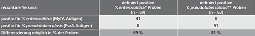 - Differenzierung zwischen einer Y. enterocolitica und Y. pseudotuberculosis Infektion erstmals serologisch möglich durch den Einsatz neuer speziesspezifischen Yersinia Antigene (PsaA, MyfA)